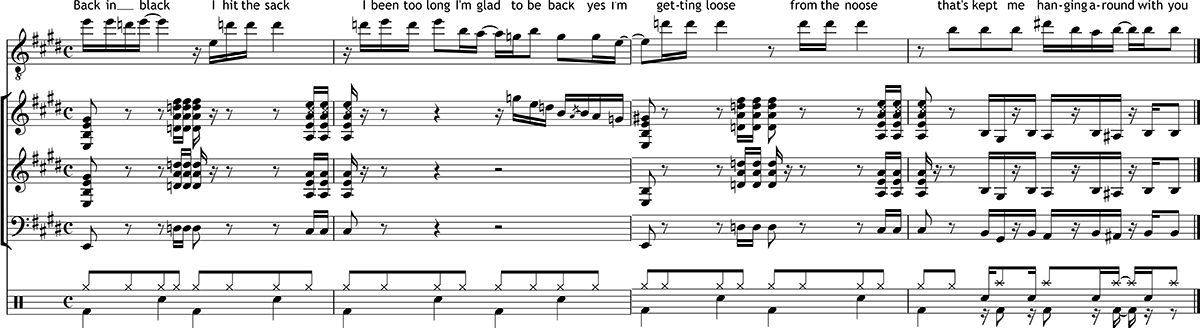 Malcolm Young, Brian Johnson; Transkription der ersten vier Takte des Verse.