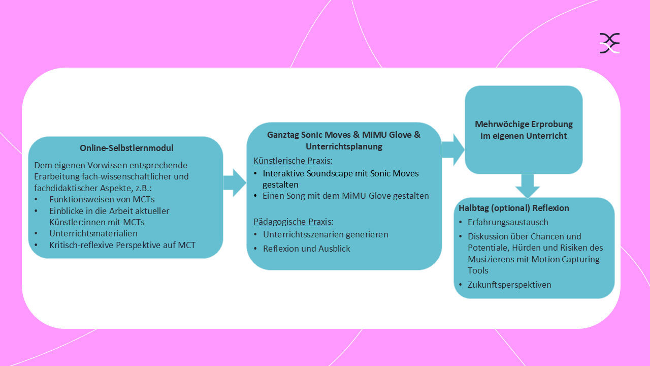 - ein Online-Selbstlernmodul, das eine individuelle Auseinandersetzung mit verschiedenen Motion Capturing Tools, wie beispielsweise Sonic Moves und MiMU Gloves ermöglicht.