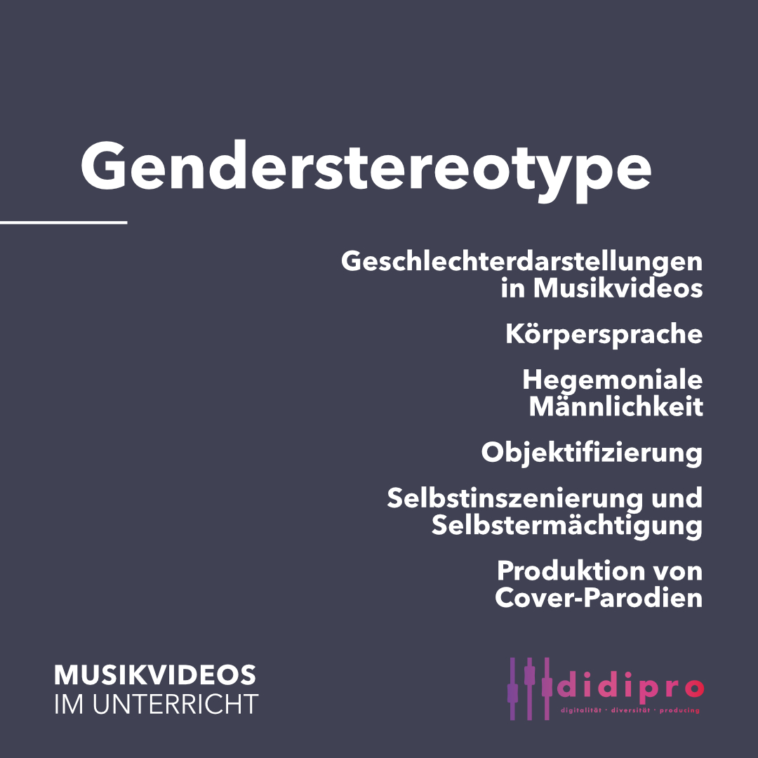 Genderstereotype - Geschlechterdarstellungen in MusikvideosDiese Einheit setzt sich kritisch mit der Darstellung von Geschlechterrollen in Musikvideos auseinander und fördert die Reflexion von Stereotypen sowie die Entwicklung eigener künstlerischer Gegenentwürfe.